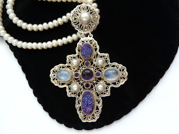 КОЛЬЕ ОТ NICKY BUTLER: ЖЕМЧУЖНАЯ НИТЬ И КУЛОН "КРЕСТ". СЕРЕБРО. ПОЛУДРАГОЦЕННЫЕ КАМНИ. 90-Е ГОДЫ 20 ВЕКА.