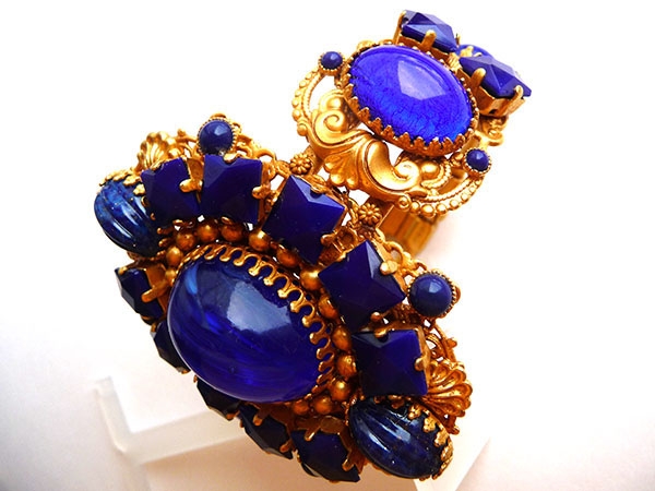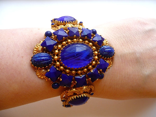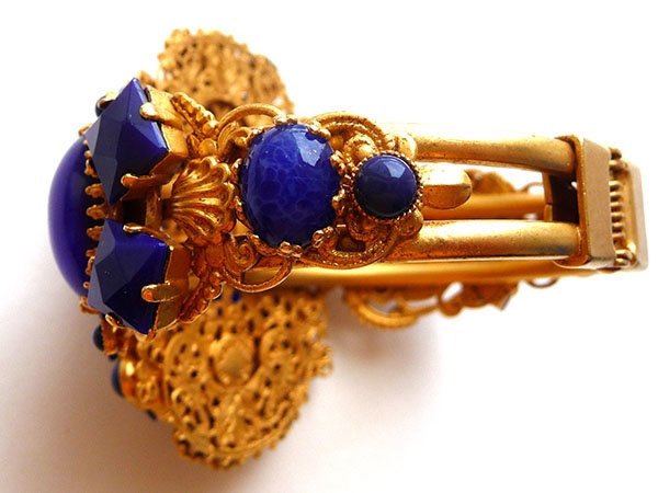 Роскошный браслет изготовлен из традиционного для Askew London ювелирного сплава на основе латуни и покрыт золотом 24К. Филигранная основа, богато декорированная узорами из латуни, украшена разными по форме, размеру, структуре вставками из стекла синего цвета. Непревзойденное мастерство, исключительный дизайн. Маркировано. Размер средний. Идеально подходит для руки, обхват которой 17-19 см. Ширина браслета (в центре) - 6,3 см. Посмотрите как замечательно он подходит к клипсам "Шанхай, составляя с ними эффектный и незабываемый комплект!