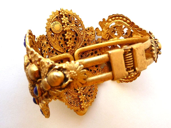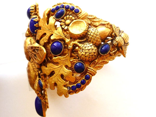 Роскошный браслет изготовлен из традиционного для Askew London ювелирного сплава на основе латуни и покрыт золотом 24К. Филигранная основа, богато декорированная растительными узорами из латуни, украшена разными по форме, размеру, структуре вставками из стекла синего цвета. Центра композиции - крупная "пчела". Непревзойденное мастерство, исключительный дизайн. Маркировано. Размер средний. Идеально подходит для руки, обхват которой 17-19 см. Ширина браслета (в центре) - 6,5 см.