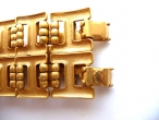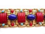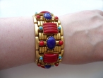 Великолепный, яркий браслет изготовлен из традиционного для Askew London ювелирного сплава на основе латуни и покрыт золотом 24К. Декор – прямоугольные резные вставки из стекла красного цвета, кабошоны из стекла насыщенного синего цвета, а также бусины и кабошоны бирюзового и красного цветов. Состояние: новый. Маркирован. Длина – 18 см. Ширина – 3 см. Посмотрите как хорошо он смотрится с серьгами "Зигзаг" от Askew London.