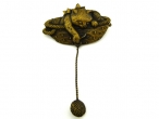 Брошь в виде котёнка, играющего с клубком, выполнена из сплава цвета бронзы с чернью. Цепочка подвижна. Клубок двусторонний. Маркирована. Состояние хорошее. Размер броши: высота - 7,5 см, ширина - 5 см.