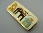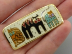 Привлекательная, яркая, оригинальная брошь изготовлена из бижутерного сплава цвета золота с 14К золотым покрытием. Декорирована разноцветными эмалями. Техника работы по эмали «клуазоне». Маркирована. Очень хорошее состояние. Размер: 4,7 см на 2 см.