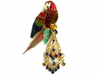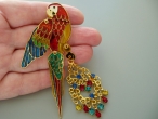 Крупная, но лёгкая брошь изготовлена из бижутерного сплава с позолотой, декорирована эмалями и кристаллами. Хвост, крылья, лапка у птицы подвижны, так же как и водопад кристаллов, соединённых ажурной сеткой, которую держит попугай. Оригинальная, эффектная, сложная брошь! Очень хорошее состояние. Маркировано. Размер: 10 см (вместе с подвесом) на 3,5 см. Вес 15 г.