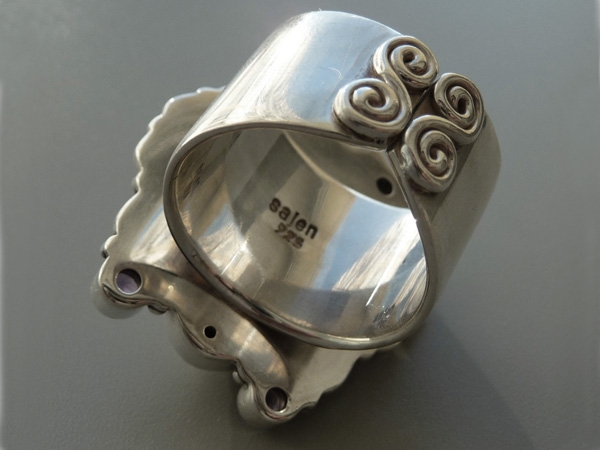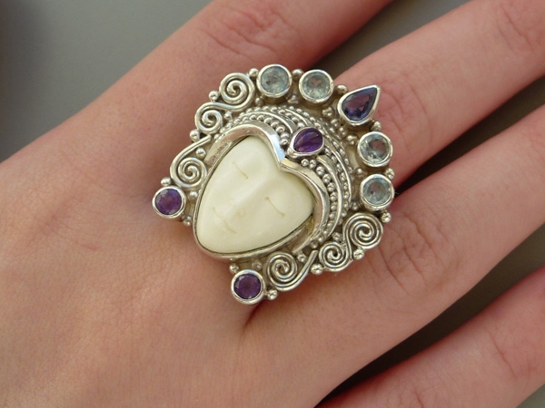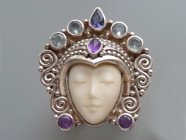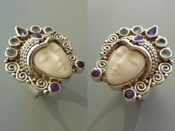 Это кольцо - находка для коллекционера! Оно относится к первым выпускам коллекции "Goddess". В дальнейшем Sajen продолжил выпускать кольца именно в этом дизайне, но они отличались по размеру центральной части, весу, количеству камней. На мой взгляд, при всей внешней схожести, они разные: в этой Богине больше силы, величия, больше магии. Кольцо выполнено из серебра. Лик - резьба по кости. Декорировано полудрагоценными камнями. Маркировано. Вес 32,6 г. Размер центральной части 3,5 см на 3,3 см. Ширина шинки от 1,7 см до 1 см (в центре). Размер кольца 20. Шинка не имеет пая.