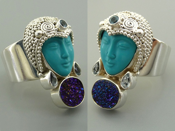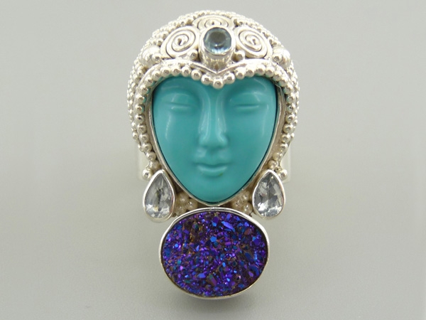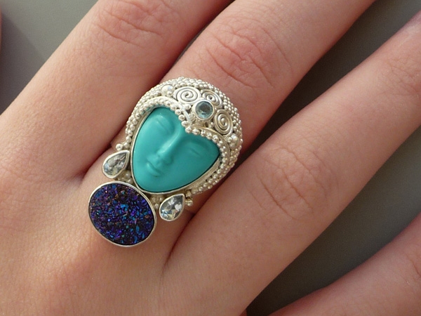 Крупное кольцо оригинального дизайна выполнено вручную из серебра. Под ликом богини, изготовленным из восстановленной бирюзы, размещается друза. Головной убор декорирован полудрагоценными камнями. Маркировано. Размер центральной части: 3,3 см на 2,3 см. Размер кольца 17,5. Шинка не имеет пая, размер может быть увеличен.