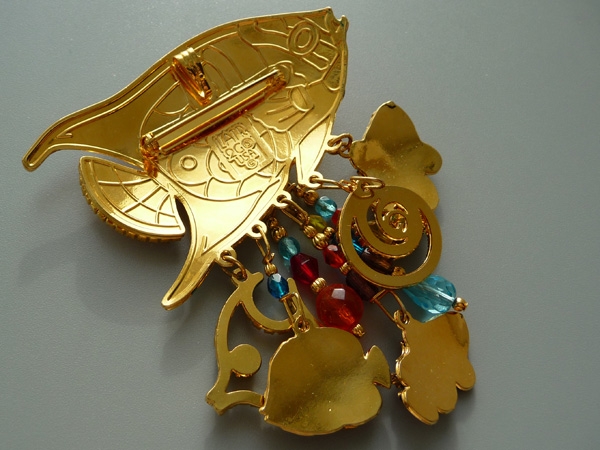 Оригинальные, яркие, позитивные украшения! Брошь в виде крупной тропической рыбы декорирована множеством звенящих подвесов. Материалы: ювелирный сплав, позолота, разноцветные эмали, кристаллы, бусины из чешского стекла. Серьги повторяют дизайн броши. Украшения этого бренда собираются и полируются вручную. Каждый цвет эмали обжигается в печи индивидуально, что не позволяет оттенкам повторяться. Маркировано LATR 2 GO. Сделано в США. Размер броши 8,5 см на 7 см. Вес 50 г. Серьги имеют размер 4 см на 3 см. Вес одной серьги 5 г.