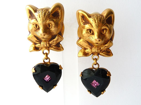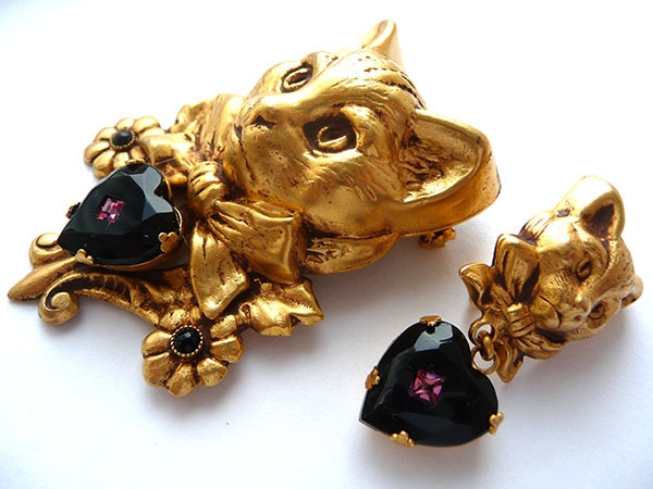 Редчайший комплект "Кот" выполнен из сплава на основе латуни и покрыт золотом в 24 К. Интересный дизайн, относящий нас к подобному украшению от JOSEFF OF HOLLYWOOD, и высочайшая техника исполнения. Очень необычен и сложен декор: в граненную вставку черного цвета в форме сердца помещен сиреневый кристалл. Великолепные украшения, которые сделают ваш образ незабываемым! Состояние: новое. Маркировано. Размер броши: 7 см на 4,5 см, глубина - 1,5 см. Размер клипс: 4.5 см на 1,7 см