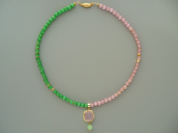 Выполнено из стеклянной имитации "кошачьего глаза" в розово-зеленых тонах. Подвес - резная роза, декорированная кристаллами и многогранная бусина (Чехия). Фурнитура - позолоченная латунь. Длина 47 см.