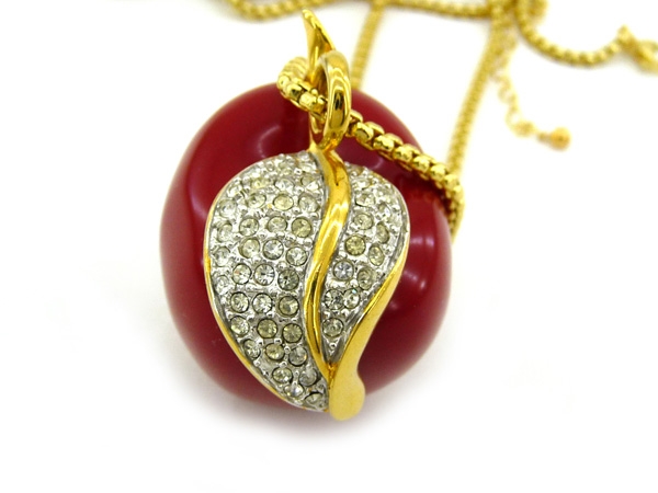 Роскошное, эффектное украшение не позволит Вам остаться незамеченной! Объемное красное яблоко, позолоченный лист которого усыпан прозрачными кристаллами, выполнено из ювелирной смолы. Высота кулона(включая стебель) - 4,5 см, ширина (в верхней части с учётом листочка) - около 4 см, глубина около 3 см. Маркировано. Цепь, изготовленная из бижутерного позолоченного сплава, имеет сложное плетение и впечатляющую длину. Кулон можно снять и носить цепь отдельно или подвесить на неё другой кулон. Изумительное творение от короля бижутерии демонстрирует совершенство дизайна в сочетании с тонкой ювелирной техникой. Длина цепи 102 см (дополнительная цепочка 5 см)