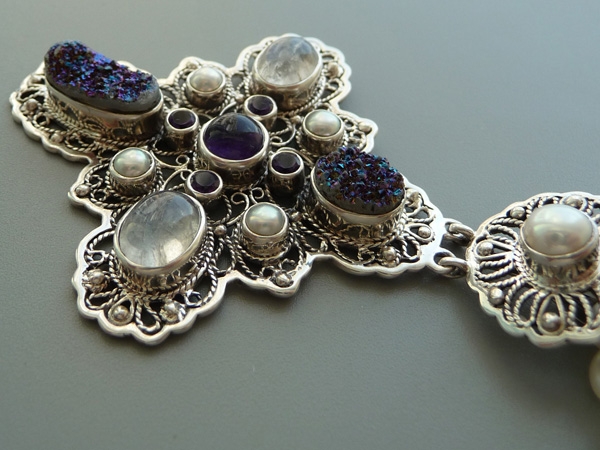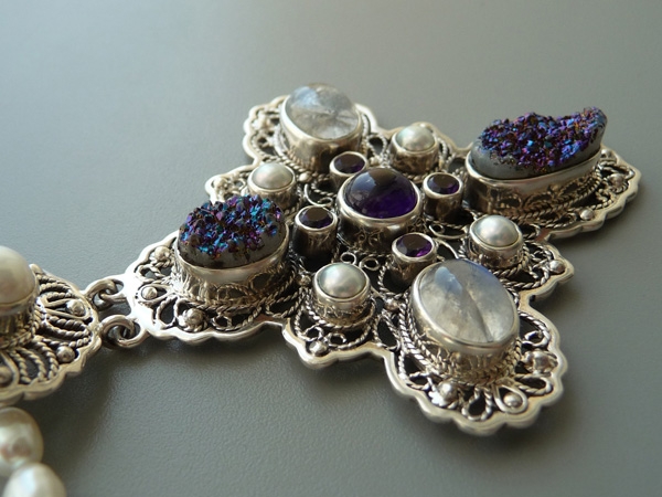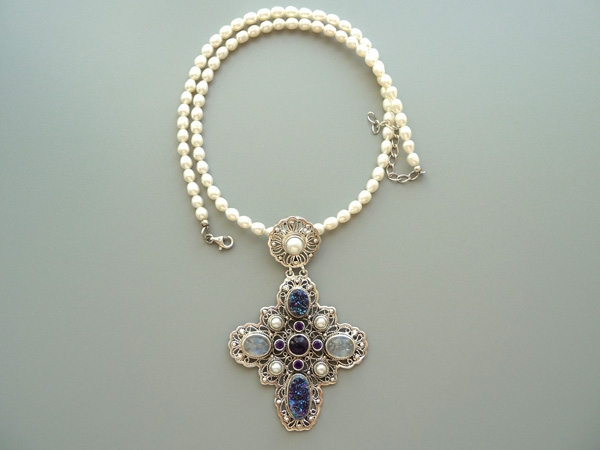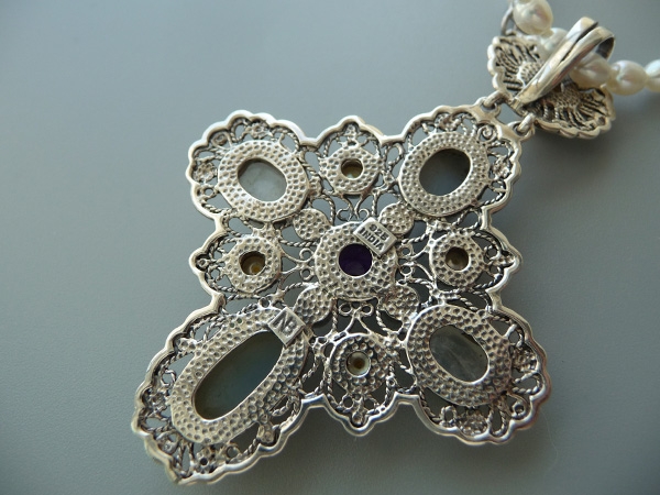 КОЛЬЕ ОТ NICKY BUTLER: ЖЕМЧУЖНАЯ НИТЬ И КУЛОН "КРЕСТ". СЕРЕБРО. ПОЛУДРАГОЦЕННЫЕ КАМНИ. 90-Е ГОДЫ 20 ВЕКА.
