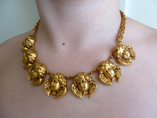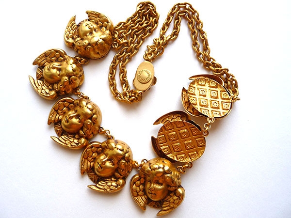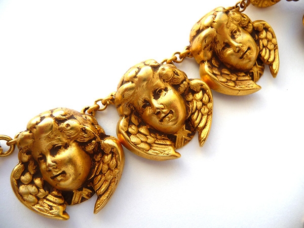 Очень красивое колье состоит из двух цепей. Его центральная часть - семь головок херувимов, объемных, прекрасно выполненных, сложно структурированных с великолепной проработкой детелаей. С таким украшением даже самый простой наряд будет смотреться королевским! Выполнено из ювелирного сплава на основе латуни и покрыто позолотой в 24 К. Маркировано. Состояние: новое. Длина колье - 43 см, диаметр вставок - 2,5 см.