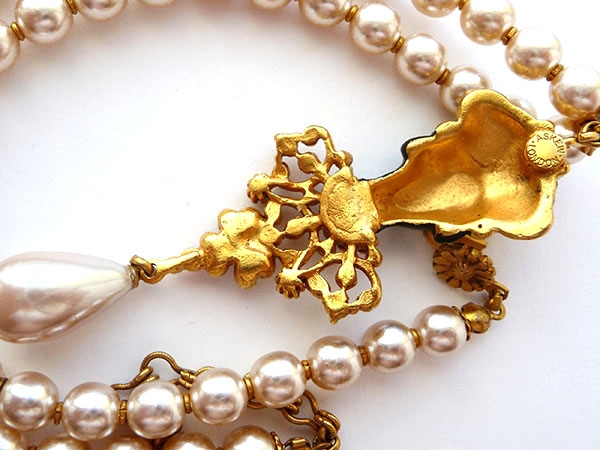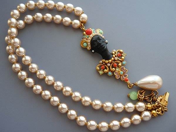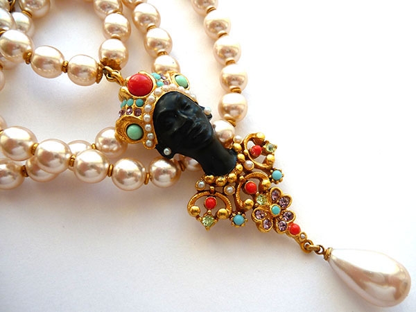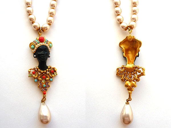 Великолепное украшение! С одной стороны, женственное и изысканное, с другой – за счет темы и цвета – эффектное, заметное, незабываемое. Фигурка африканской принцессы, чей лик покрыт черной эмалью, а наряд декорирован кабошонами и кристаллами под драгоценные камни, подвешен на жемчужные бусы. Бусины под жемчуг гармонично сочетаются с крупным подвесом каплевидной формы из этого же материала. Изготовлено вручную. Сплав на основе латуни, позолота 24К. Состояние: новое. Маркировано. Размер подвеса: 7 см на 2,5 см. Длина колье – 50 см.