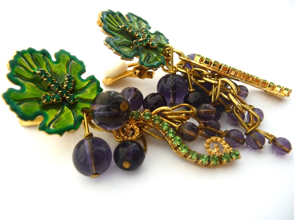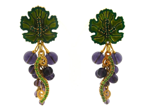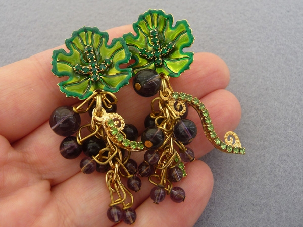 Украшения известной американской фирмы выполнены вручную из ювелирного сплава с позолотой 24К и украшены эмалью в оттенках зелени, кристаллами Swarovski, бусинами фиолетового цвета. Маркированы. Очень хорошее состояние. Длина (с подвесами) - 5,8 см, ширина - 2,3 см.