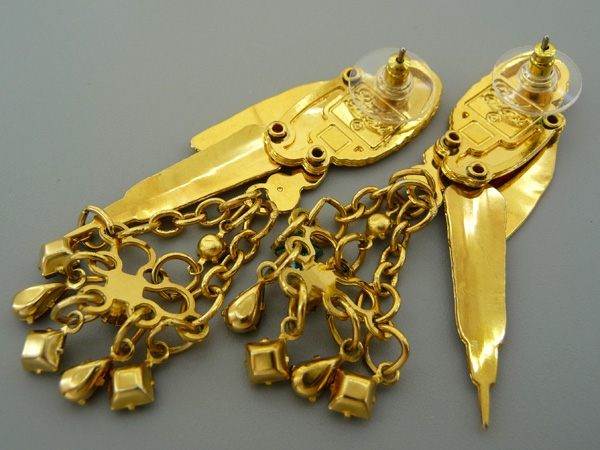 Крупные, лёгкие, яркие серьги пусеты изготовлены из бижутерного сплава с позолотой, декорированы эмалями и кристаллами. Хвост, крылья, лапка у птиц подвижны, так же как и водопад кристаллов, соединённых ажурной сеткой, которую держат попугаи. Очень хорошее состояние. Маркированы. Размер: 6,5 см (вместе с подвесом) на 2 см. Вес одной серьги 6,2 г