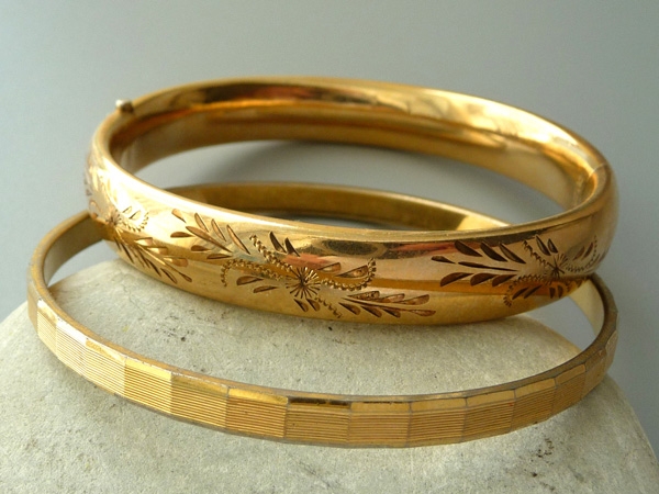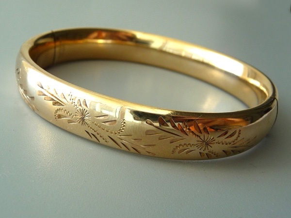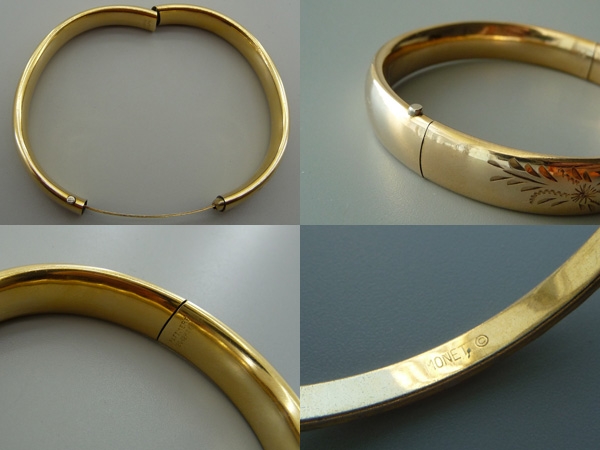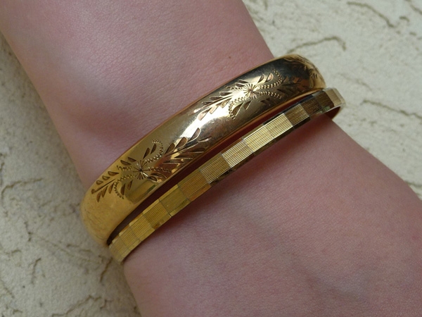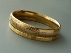 Винтажный позолоченный браслет с узором имеет форму чуть приплюснутого круга (идеально ложится на запястье) и сложную застёжку. Застёжка: button/hinge clasp. Нажатие на кнопку (которая фиксирует механизм) позволяет браслету распахнуться на длину внутренней пластины (на 4 см), что делает надевание украшения очень удобным, а также защищает его от утери. Состояние: отличное для своего возраста. Маркировано Сraftmere1/20-12 Kt GF. Внутренний размер 6 см на 5,7 см.