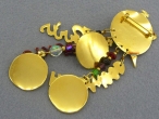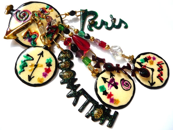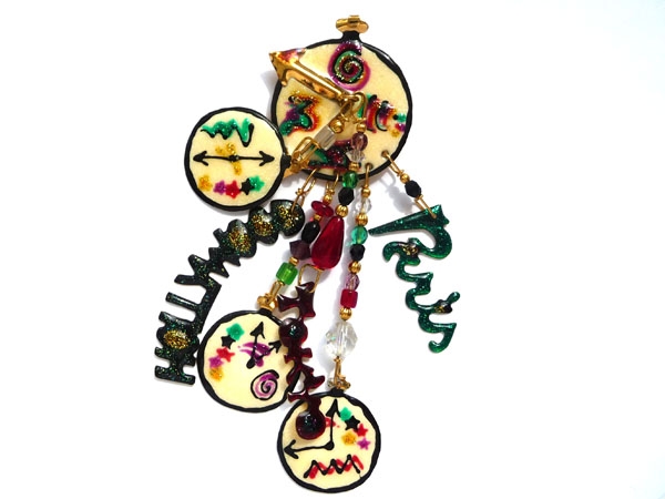 Оригинальная, ироничная брошь в виде множества циферблатов, показывающих разное время, а также подвесов с названиями городов, выполнена из бижутерного сплава. Покрыта позолотой, декорирована разноцветными эмалями и бусинами из чешского стекла. Собрана и отполирована вручную. Каждый цвет эмали обжигался в печи индивидуально, что не позволяет оттенкам повторяться. Легкая, яркая, сложная, звенящая! Хорошее состояние. Маркировано: Lunch at the Ritz 1988. Длина - 11,5 см. Ширина основного циферблата - 3,5 см.