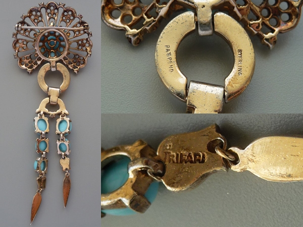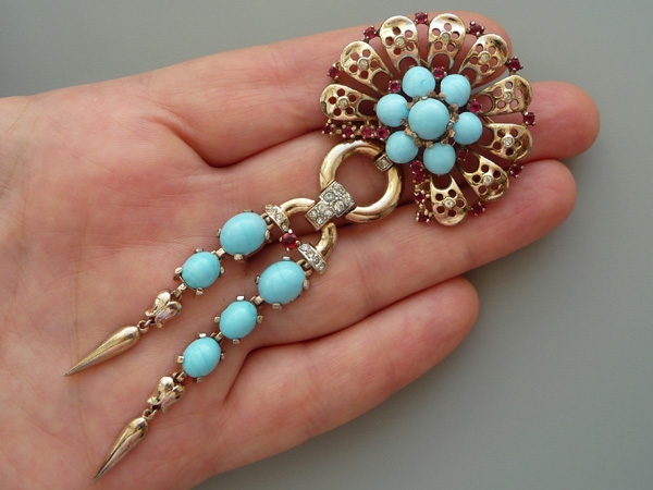 Великолепное коллекционное украшение выполнено из серебра с позолотой. Декорировано кабошонами под бирюзу, а также кристаллами, имитирующими бриллианты и рубины. Дизайн A. Philippe. Маркировано: TRIFARI. STERLING. Патент 145585 от 1946 года. Отличное для своего возраста состояние. Размер: высота - 10,5 см, ширина - 4 см. Если необходимы дополнительные фото (а также видео), пишите. Они будут вам отправлены на электронную почту.