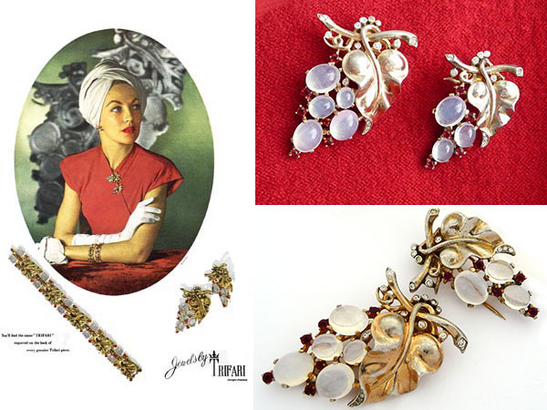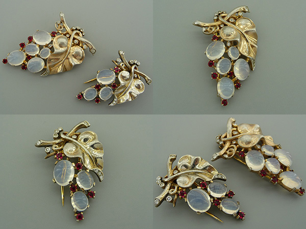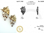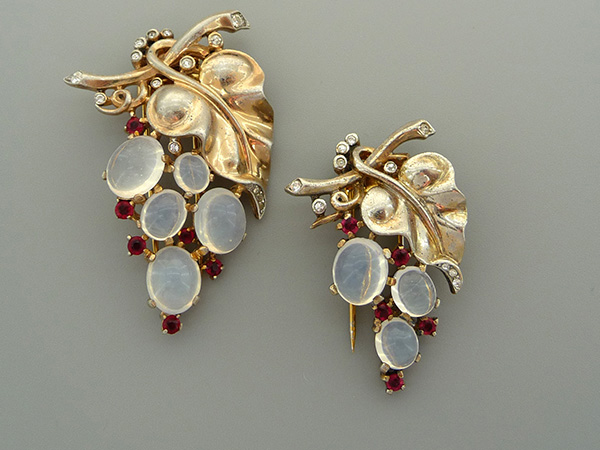Знаменитое, великолепное творение А.Philippe: Dress Clips "Виноград" от Trifari. Зажимы выполнены из серебра с позолотой, декорированы белыми кабошонами под опал, красными и прозрачными кристаллами. Маркировано: TRIFARI, STERLING, номер патента 140898. Отличная для своего возраста сохранность! Размер большого клипа: 5,4 см на 3,6 см. Малый клип - 4,2 см на 3 см.