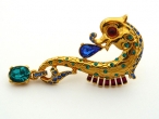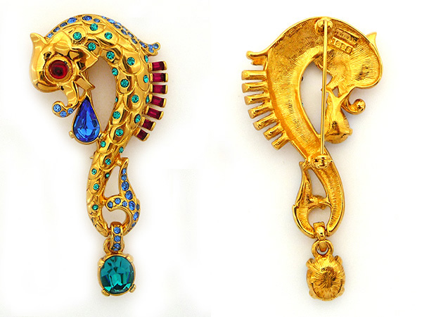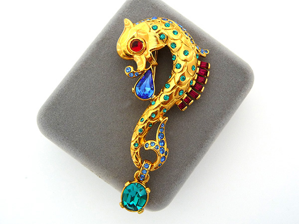 Реплика роскошной броши "Морской конек" дизайна знаменитого A. Philippe, патент на дизайн которой был получен в 1948 году. Компания перевыпустила самые известные свои броши в 90-х годах, используя при этом прежние формы и внеся небольшие изменения в их декор. Следует отметить, что реплики произведений от Трифари пользуются у коллекционеров и любителей винтажной бижутерии таким же спросом. Они ничуть не уступают по технике исполнения оригиналам. Эта изящная, эффектная брошь выполнена из ювелирного сплава цвета золота и декорирована разными по цвету и форме кристаллами и кабошонами. Маркировано: Trifari 1996. Размер: высота - 7 см, ширина - 3,5 см. Состояние: отличное (как новое).