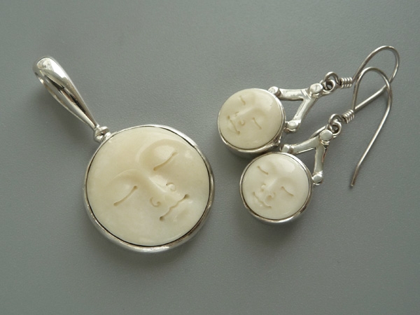 Комплект: серьги и подвеска "Лики". Коллекция "Goddess". Sajen. Серебро. Кость. 90-е годы 20 века.