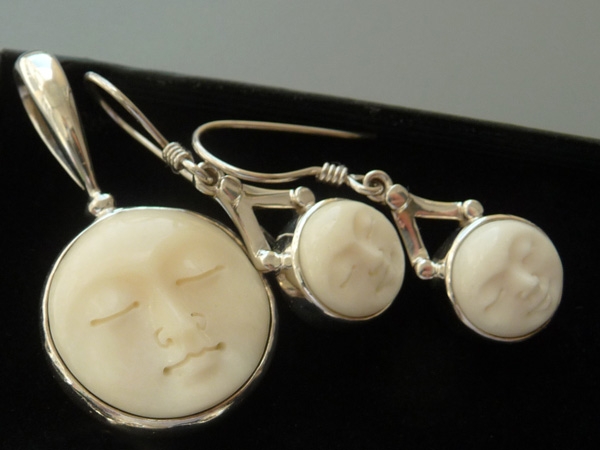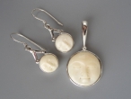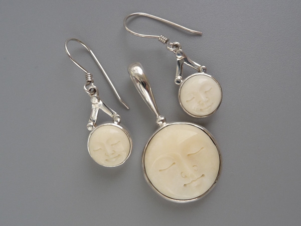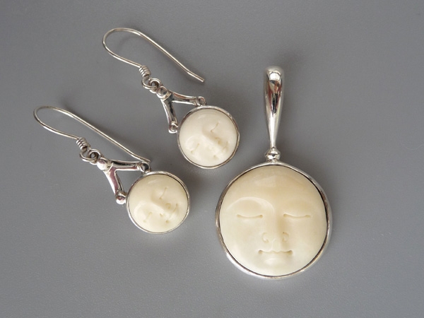 Лаконичный комплект изготовлен из серебра. Лики - резьба по кости. Все части маркированы. Состояние: новое. Подвеска: длина - 4 см, диаметр лика - 2,3 см. Серьги: длина - 3,7 см., диаметр лика - 1,3 см.