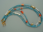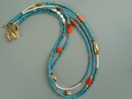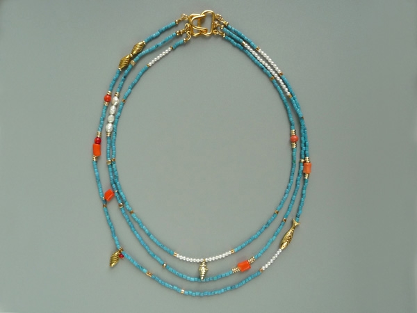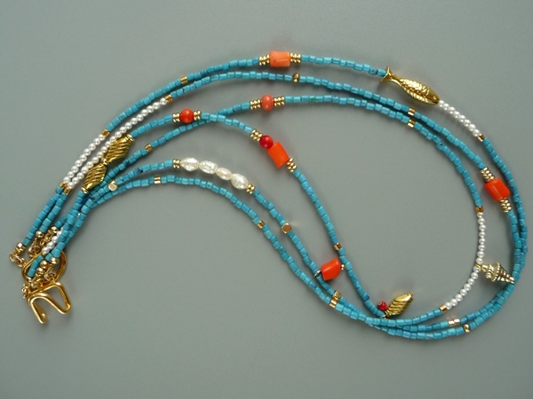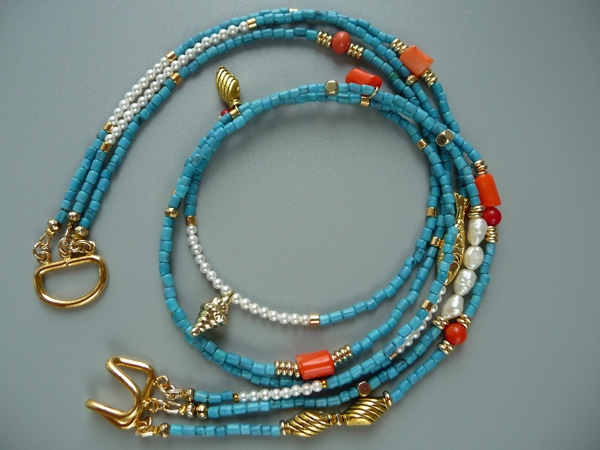 Очень нежное и красивое колье состоит из трёх нитей голубого бисера, жемчуга (речного и Majorica), натурального коралла, позолоченных латунных бусин различных форм, подвески в виде ракушки. Необычное украшение, яркое, индивидуальное, эффектное, лёгкое! Длина по короткой нити - 43 см.